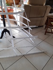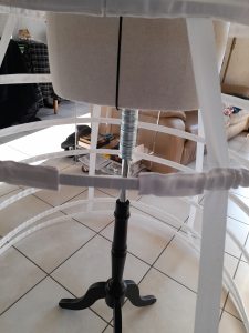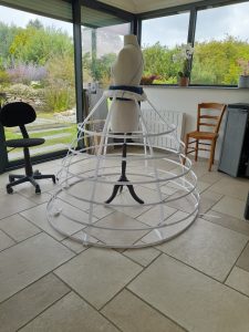 La crinoline montée, je me suis aperçue que le dernier cerceau, celui du haut était bien trop grand par rapport à la finesse de mon mannequin, donc pour équilibrer ma crinoline, j’ai réduit la taille du cerceau et l’ai mis à 168 au lieu de 178 cm. Il s’agit donc aussi que la crinoline soit jolie et équilibrée à la vue. Les calculs peuvent donc être rectifiés.