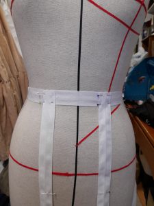 Installer la crinoline sur le mannequin de couture. Passer les baleines en acier dans les coulisses en commençant par celle du bas.