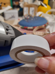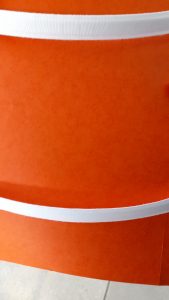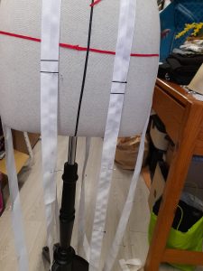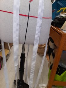 Couper ces rubans plus longs que la hauteur de jambe, il faut penser à l’arrondi de la crinoline ainsi que l’ourlet qu’il faudra faire plus tard, sachant que la crinoline doit être à environ 12 voire 13 cm du sol (la mienne est de 120 cm environ)