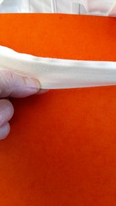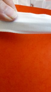 – soit les faire soi même avec du sergé de 2 à 3 cm de largeur, ce que j’ai fait avec du sergé de 2,5 cm de large. Pour cela, coudre deux bandes de sergé ensemble en réservant 1 cm d’ourlet à chaque extrémité . Coller les bords avec de la colle textile auparavant.