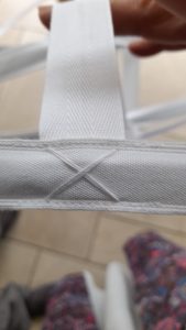Les coulisses peuvent être cousues à la machine à conditions d’enfiler les baleines après sinon il y a un risque d’abimer la machine à coudre (ce qui m’est arrivé). On peut aussi coudre les coulisses à la main si les baleines sont déjà dedans, il suffit de faire un croisillon en trois passages avec du cordonnet (fil plus épais et beaucoup plus solide).