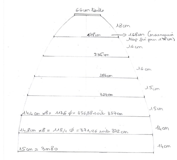 J’ai choisi une crinoline de 3m80, le cerceau le plus grand en bas est représenté par 15 cm, la hauteur pour 1m20 de crinoline est de 15 cm sur le shéma. L’échelle est donc de 1/8ème (120 cm / 15 cm de hauteur).