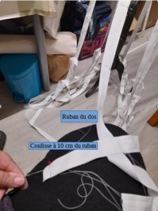 Epingler toutes les coulisses sur les rubans en commençant par le dos en laissant 10 cm de coulisses pour faciliter la fermeture ensuite.