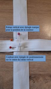 Sur chaque ruban, mesurer la hauteur ou placer les coulisses, mettre des marques. Au début j’ai utilisé un stylo magique, ensuite avec l’habitude j’ai juste utilisé des épingles. Décider si les coulisses enfermant les baleines seront dessous ou dessus cette marque car ensuite il faudra toujours poser les baleines de façon identique, soit en dessous, soit en dessus (en dessous à droite et au dessus à gauche sur la troisième photo).